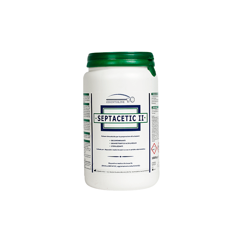 Septacetic II is a water-soluble powder for the preparation of decontaminating, disinfecting and sterilising solutions for invasive and non-invasive medical devices. The powder is dispersed in warm water and generates a chemical-physical reaction resulting in the formation of peracetic acid and hydrogen peroxide with enhanced bactericidal activity.